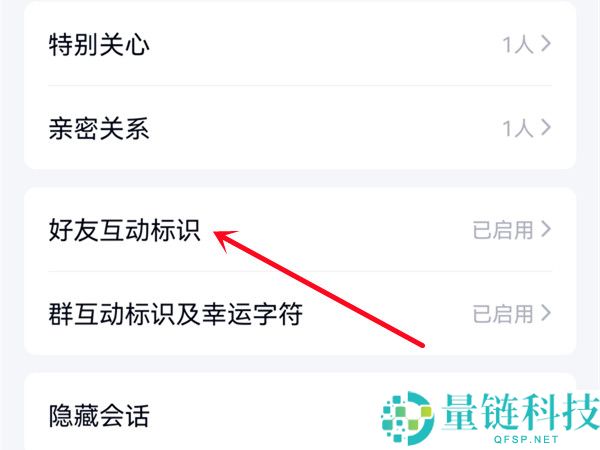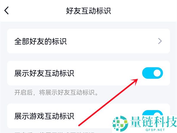 3、点击【好友互动标识】,点击【展示好友互动标识】右侧的开关即可隐藏和显示qq火花(如图所示)。