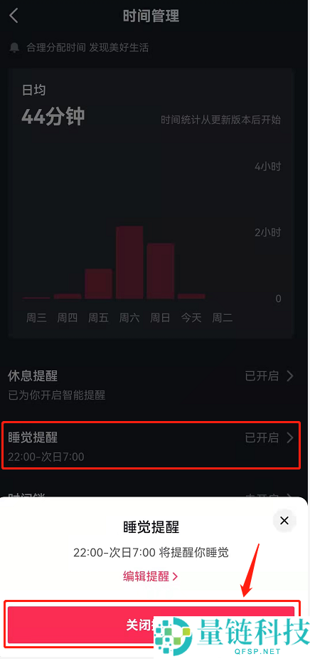 3、最后点击睡觉提醒可以看到下方弹出的关闭提醒选项,确认一下即可关闭成功。