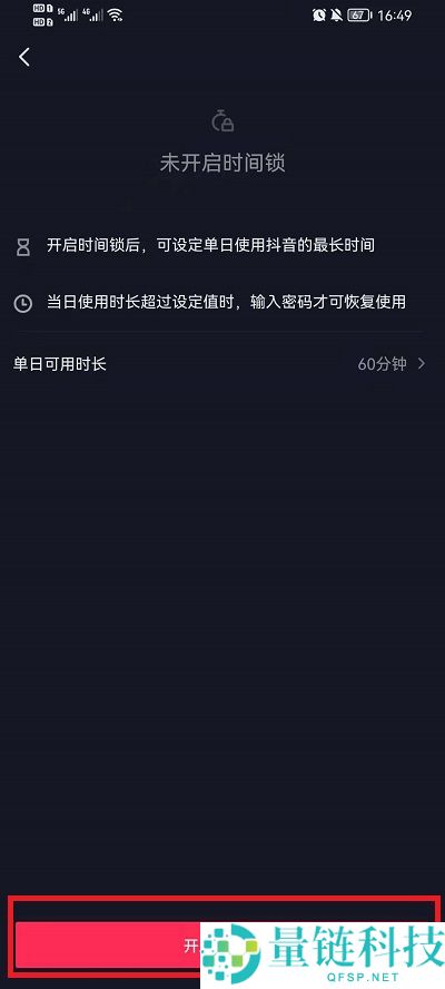 4、最后在时间锁功能界面,点击下方的【开启时间锁】就可以进行时间锁的设定,设定一个时间段提醒用户关闭抖音。