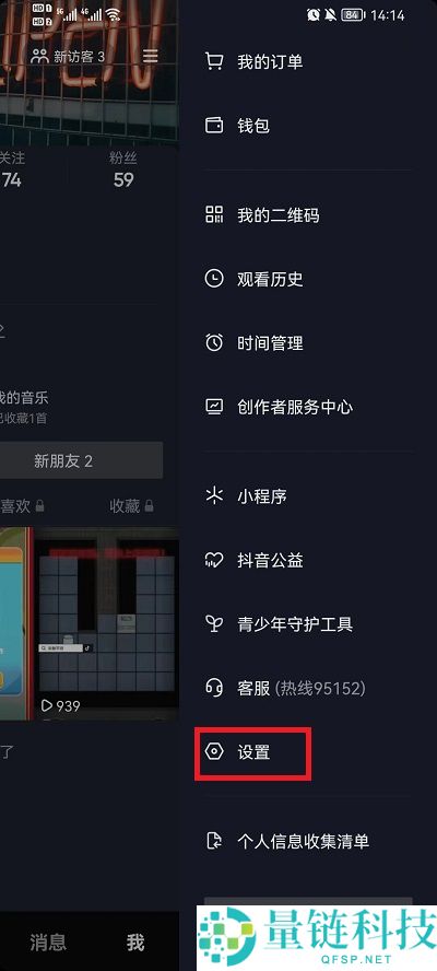 2、随后会弹出一个测边栏,在侧边栏中可以打开下方的【设置】进入到设置中;